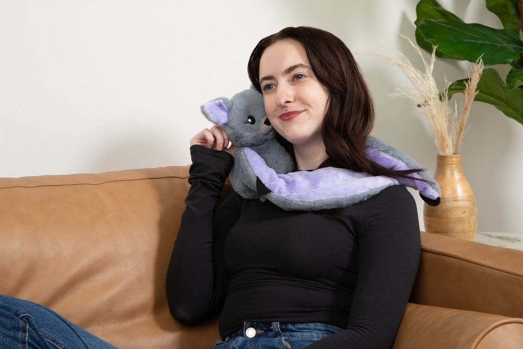 Image showing a young woman with long dark hair resting with her eyes closed on a couch with Quinn the Koala Hugimal on her chest. The Koala is hugging her and she is hugging it back.